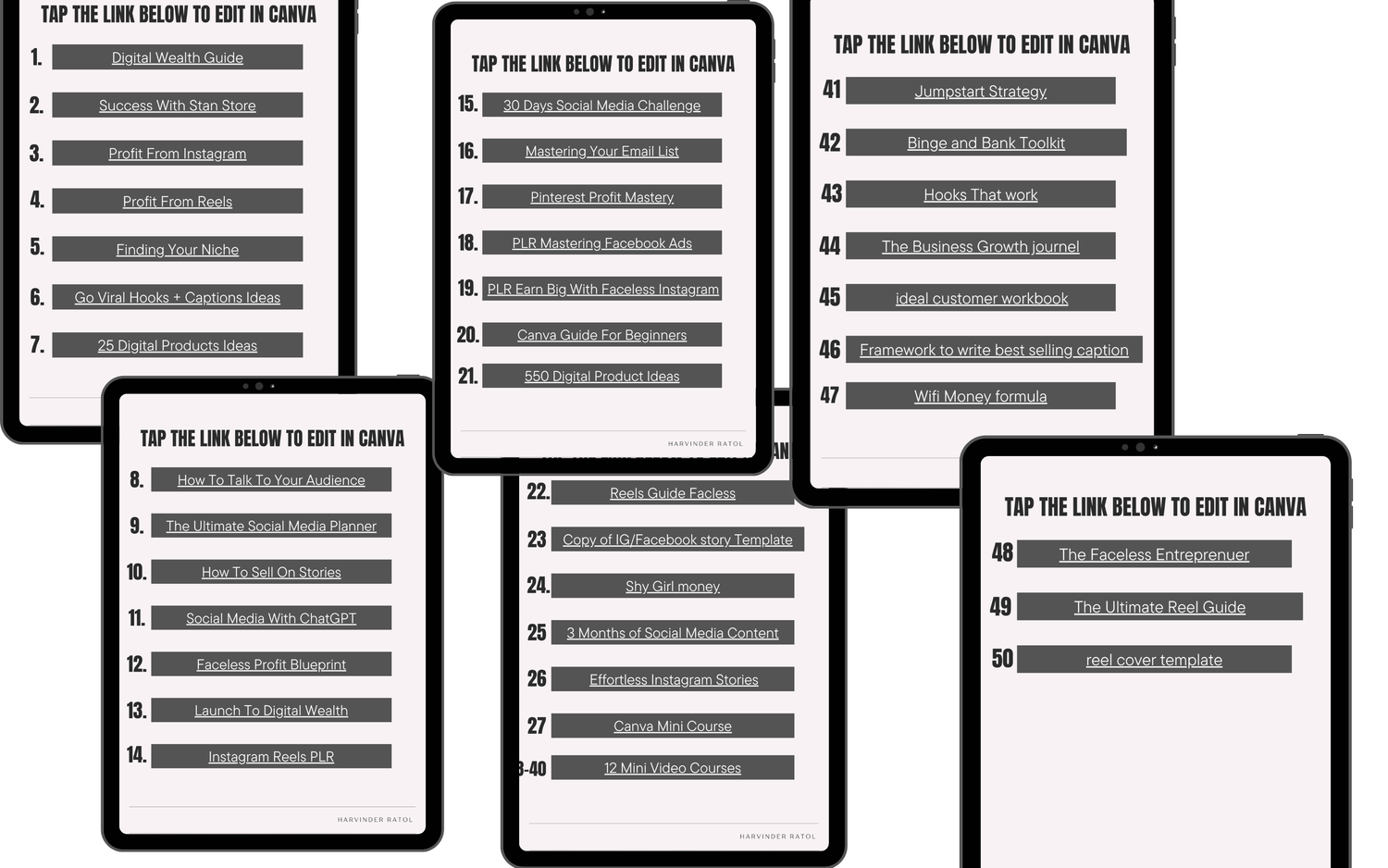Learn Canva, IG Marketing, Digital Product Creation, Content Strategy, and more — all in bite-sized, beginner-friendly video trainings.